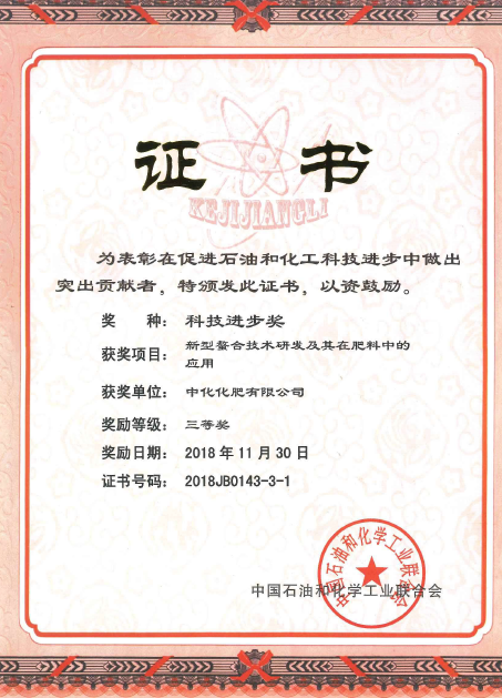 2018年12月3日,中國石油與化學(xué)工業(yè)聯(lián)合會科技獎勵大會在北京舉行,中化化肥“新型螯合技術(shù)研發(fā)及其在肥料中的應(yīng)用”成果,榮獲2018年中國石化聯(lián)合會科技進步三等獎。