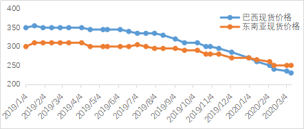巴西和東南亞市場氯化鉀現(xiàn)貨價格(CFR 美元/噸)