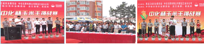啟動儀式由黑龍江省農(nóng)委科教處副處長周曉兵主持,上午9時,在一片熱烈的禮炮聲中隆重拉開帷幕,黑龍江分公司、黑龍江省農(nóng)委、齊齊哈爾市農(nóng)委、龍江縣縣委、龍江縣農(nóng)業(yè)局分別派代表列席參加,省農(nóng)委副主任李連瑞在啟動儀式上發(fā)表講話,他說“中化杯玉米王挑戰(zhàn)賽既是推進糧食穩(wěn)定增產(chǎn)、加快現(xiàn)代化大農(nóng)業(yè)發(fā)展的一項重要內(nèi)容,也是貫徹落實中央一號文件,加快推進農(nóng)業(yè)科技創(chuàng)新的重大舉措,必將對提升我省玉米標(biāo)準(zhǔn)化生產(chǎn)水平、增加農(nóng)民收入起到極大的促進和推動作用”。黑龍江分公司總經(jīng)理吳權(quán)在啟動儀式上講到作為此次“中化杯玉米王挑戰(zhàn)賽”活動的唯一戰(zhàn)略合作企業(yè),將密切與農(nóng)業(yè)部及地方農(nóng)業(yè)主管部門配合,通過科研、試驗示范、農(nóng)化服務(wù)繼續(xù)為廣大農(nóng)民朋友們提供良種、良肥、良藥和良技等配套技術(shù)方案,堅定不移的做好科技興農(nóng)工作。吳總的講話向社會各界充分地展現(xiàn)了中化化肥作為國內(nèi)最大的化肥供應(yīng)商和分銷服務(wù)商,在我國糧食安全和農(nóng)業(yè)可持續(xù)發(fā)展的國家戰(zhàn)略中,一直發(fā)揮著國家隊,排頭兵的作用。