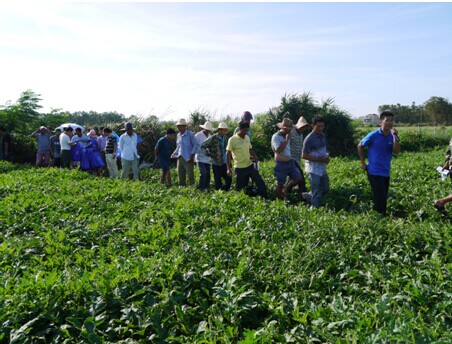 2014年7月3日,海南分公司中化智勝螯合肥套餐黑美人西瓜實驗示范田觀摩會在東方市八所鎮(zhèn)居龍新村圓滿召開。此次活動邀請了當(dāng)?shù)亟?jīng)銷商、西瓜種植大戶共30余人參加。