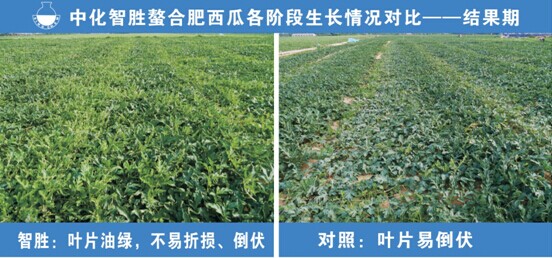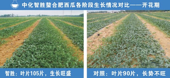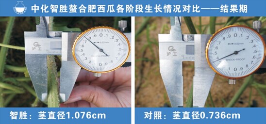 在活動現(xiàn)場,對比對照中,中化智勝螯合肥實驗組主要體現(xiàn)出以下四個特點:一、西瓜地上西瓜各個時期的生長態(tài)勢明顯比對照旺盛,達到了旺長快發(fā)的目的。二、葉片長寬,說明葉面積更大,光合作用面積更大,好比嘴巴更多,吃得多,長得也快;三、莖干較粗,那么植物光合作用后的產(chǎn)物輸送能力更強,好比公路更寬,車輛流通能力就更強;四、瓜長的更大更快,有利于農(nóng)戶提早上市賣出好的價格。
