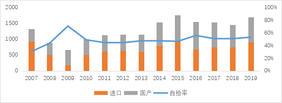 中國鉀肥進口量、國產(chǎn)量(萬噸,氯化鉀)和自給率