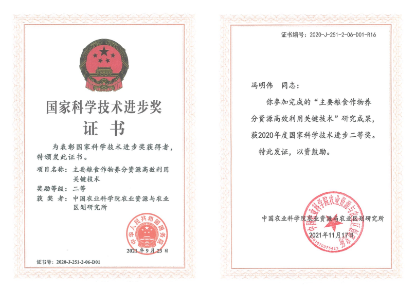 由中化化肥控股有限公司執(zhí)行董事馮明偉等人參加完成的中國農(nóng)業(yè)科學院資源與農(nóng)業(yè)區(qū)劃研究所“主要糧食作物養(yǎng)分資源高效利用關鍵技術”研究成果,榮獲由中華人民共和國國務院頒發(fā)的“2020年度國家科學技術進步二等獎”(證書號:2020-J-251-2-06-D01,日期:2021年9月23日;人員證書編號:2020-J-251-2-06-D01-R16,日期:2021年11月17日),為中國農(nóng)業(yè)實現(xiàn)科學施肥、雙增雙減和中化化肥貫徹科學至上及可持續(xù)發(fā)展打下堅實基礎。