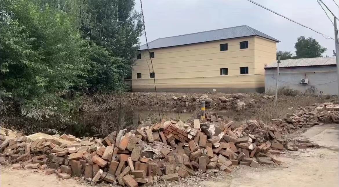 沖鋒隊(duì)連夜準(zhǔn)備救援物資、聯(lián)系運(yùn)輸車輛,8月8日清晨5點(diǎn),3噸84消毒液、3萬(wàn)片消毒片以及5000余斤新鮮蔬菜開始裝車,隨即隊(duì)員們馬不停蹄跟車奔赴災(zāi)區(qū)一線。沖鋒隊(duì)分別前往受災(zāi)較為嚴(yán)重的涿州市刁窩鎮(zhèn)小義和莊、豆莊鎮(zhèn)前屯田村、后屯田村開展援助。抵達(dá)災(zāi)區(qū)后,眼前的景象讓隊(duì)員們心痛不已:道路上遍地都是洪水沖刷的痕跡,村里的房屋上、墻壁上殘留著大量淤泥,有些房屋的地基下沉,有的甚至徹底倒塌……看著滿目瘡痍的場(chǎng)景,沖鋒隊(duì)員們顧不上片刻休憩,只想著盡快搬卸救援物資,第一時(shí)間送到老鄉(xiāng)手里。