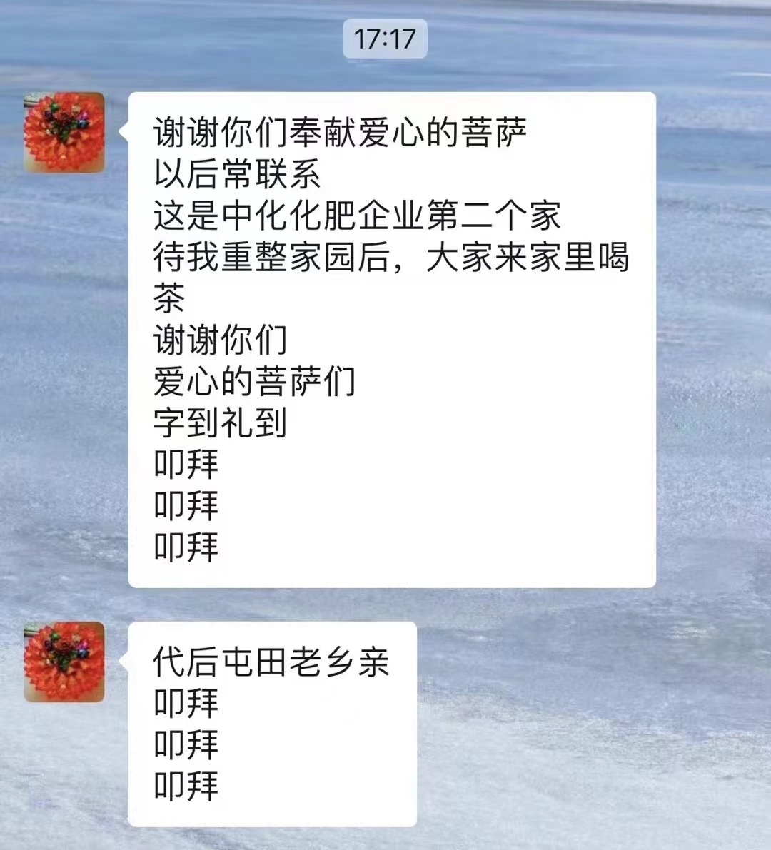 沖鋒隊(duì)的表現(xiàn)得到了廣大村民的贊賞和認(rèn)可,村民陳艷麗動(dòng)情地表示:“這里就是中化化肥的第二個(gè)家,待到家園重整,各位家人們一定要?;丶铱纯?。”