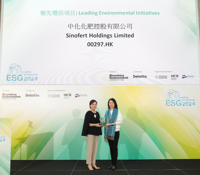 11月27日,《彭博商業(yè)周刊/中文版》與德勤聯(lián)合舉辦第六屆“ESG領(lǐng)先企業(yè)”頒獎(jiǎng)典禮,旨在表彰在環(huán)境、社會和公司治理(ESG)方面表現(xiàn)卓越的上市公司與資產(chǎn)管理機(jī)構(gòu),激勵(lì)企業(yè)積極實(shí)施ESG戰(zhàn)略,攜手推動對環(huán)境和社會具有積極影響的可持續(xù)發(fā)展進(jìn)程。期間,中化化肥控股有限公司(股票代碼:0297.HK)旗下“中化長山低碳環(huán)保綜合治理項(xiàng)目”榮獲“領(lǐng)先環(huán)保項(xiàng)目”獎(jiǎng)項(xiàng)、“第三代生物磷肥項(xiàng)目”榮獲“領(lǐng)先社區(qū)項(xiàng)目”獎(jiǎng)項(xiàng)。