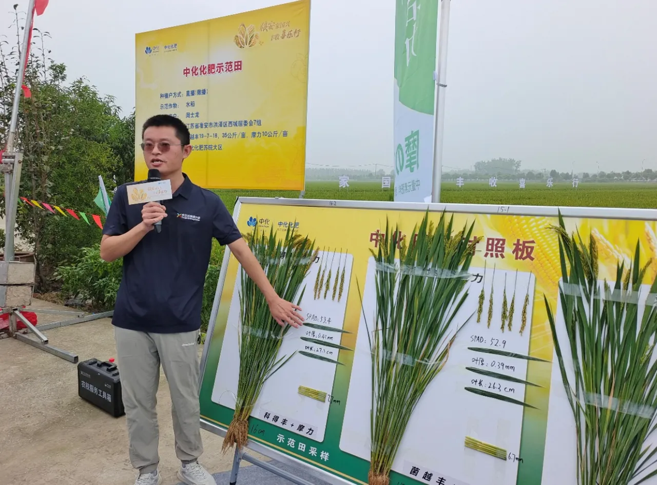 “在‘科得豐/菌越豐+摩力’種植方案的加持下,示范田水稻根系吸收好、養(yǎng)分輸送快、劍葉光合作用強。這也意味著示范田水稻的灌漿效率更高、穗頭更大、籽粒也更飽滿,最終落實在產(chǎn)量水平上也會更上一步臺階。” 中化化肥蘇皖大區(qū)農(nóng)藝師沈鵬激動地說道。