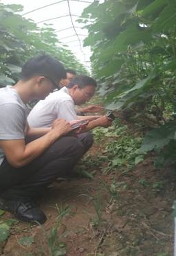 出診情況:種植大戶蔣應(yīng)斌的西瓜長勢出現(xiàn)問題,經(jīng)過診斷,為用戶施肥不當,出現(xiàn)肥害現(xiàn)象。當即提出四種方法,一、排水、放棚降溫。二、人工點花授粉,提高坐果率。三、加強蟲害防治管理。四、控制瘋長,提高結(jié)瓜率。半個月后,肖老師一行回訪種植戶,單瓜重3-4公斤,產(chǎn)量與對照相當,在每個大棚的苗頭有少部分畸形瓜和大肚臍瓜,大戶繼續(xù)加強后期田間管理,將損失降到最低程度。