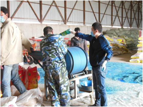 農(nóng)化人員現(xiàn)場(chǎng)指導(dǎo)玉米種子包衣
