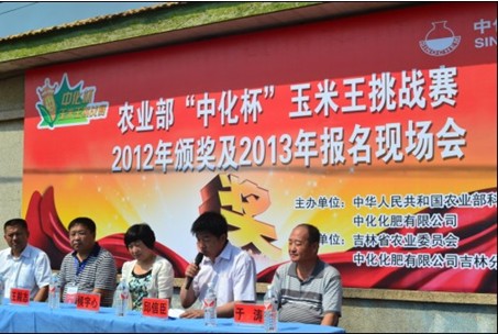 2013年6月23日,中化化肥吉林分公司聯(lián)合吉林省農(nóng)業(yè)委員會、九臺市農(nóng)業(yè)技術(shù)推廣站、九臺市沐石河鄉(xiāng)鎮(zhèn)府在沐石河鎮(zhèn)大集召開了“中化杯”玉米王挑戰(zhàn)賽2012年頒獎及2013年報名現(xiàn)場會,大會得到了吉林電視臺新聞聯(lián)播的大力支持。