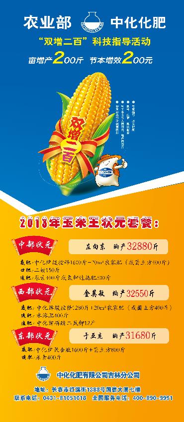 由農(nóng)業(yè)部開(kāi)展玉米“雙增二百”科技行動(dòng)啟動(dòng)以來(lái),吉林分公司繼續(xù)為此項(xiàng)目做好落實(shí)及科技服務(wù)等系列工作。吉林分公司依據(jù)吉林東部,西部,中部的實(shí)際情況和與各個(gè)地區(qū)玉米王“狀元”施肥情況的交流,推出2013年玉米王狀元套餐。推出的三種套餐,因地制宜,非常適合所屬地區(qū)種植。