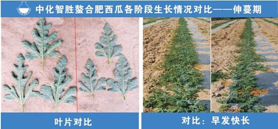 在活動現(xiàn)場,對比對照中,中化智勝螯合肥實驗組主要體現(xiàn)出以下四個特點:一、西瓜地上西瓜各個時期的生長態(tài)勢明顯比對照旺盛,達到了旺長快發(fā)的目的。二、葉片長寬,說明葉面積更大,光合作用面積更大,好比嘴巴更多,吃得多,長得也快;三、莖干較粗,那么植物光合作用后的產(chǎn)物輸送能力更強,好比公路更寬,車輛流通能力就更強;四、瓜長的更大更快,有利于農(nóng)戶提早上市賣出好的價格。